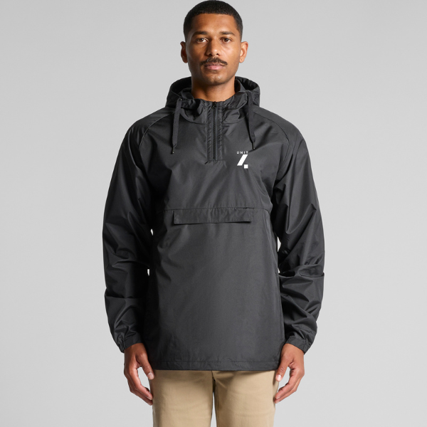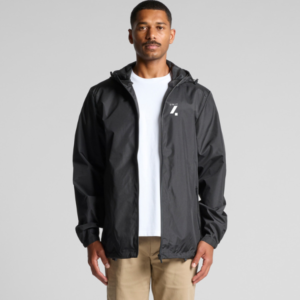 Zip Jacket, crafted from light weight recycled polyester rip-stop. Features include waterproof zips, adjustable drawcords, rubber headphone patch, sealed seams, and packable design. Suitable for light showers.